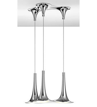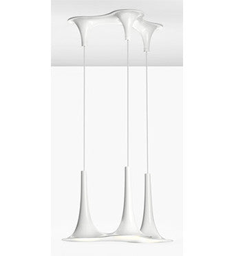 Collection of suspensions and ceiling lamps with one or three lights in injection moulded white ABS, available in the chrome exterior / white interior, white exterior / gold interior, white exterior / white interior versions. LED light sources with GU10 fitting. Recessed downlight with three lights, available in the chrome, gold and white versions with LED light source.Light as a complement to sound. That's the idea that initiated Karim Rashid's design of the Nafir Pendant by AXO Light. It was further inspired by Rashid's fascination with morphing flat surfaces into fluid 3D shapes. The Nafir meets both inspirations with a lengthy trumpet-shaped shade (similar to the North African nafir trumpet) made out of ABS plastic. A glossy White finish (either monochromatic or contrasting with external Chrome or internal Gold) enhances the smooth lines. Italy's AXO Light combines traditional Venetian glasswork and artisan craftwork with avant-garde lighting techniques and innovative materials. Their design philosophy is clear: use creativity and inspiration to create stunning lighting replete with value and emotion.