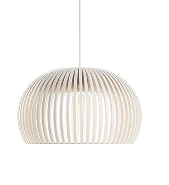 Pendant lamp Atto 5000 by Finnish lamp manufacturer Secto has a dome-shaped shade which perfectly harmonizes with round tables and builds an interesting contrast to rectangular ones. The light is distributed downwards and also strayed laterally. Like all Secto designer lights, Atto 5000 has a shade made form birch plywood slats connected with aircraft plywood. They are optionally available in natural birch, birch with walnut veneer on the exterior as well as white or black laminated birch. The three latter versions remain birch-coloured inside resulting in an iridescent colour effect.